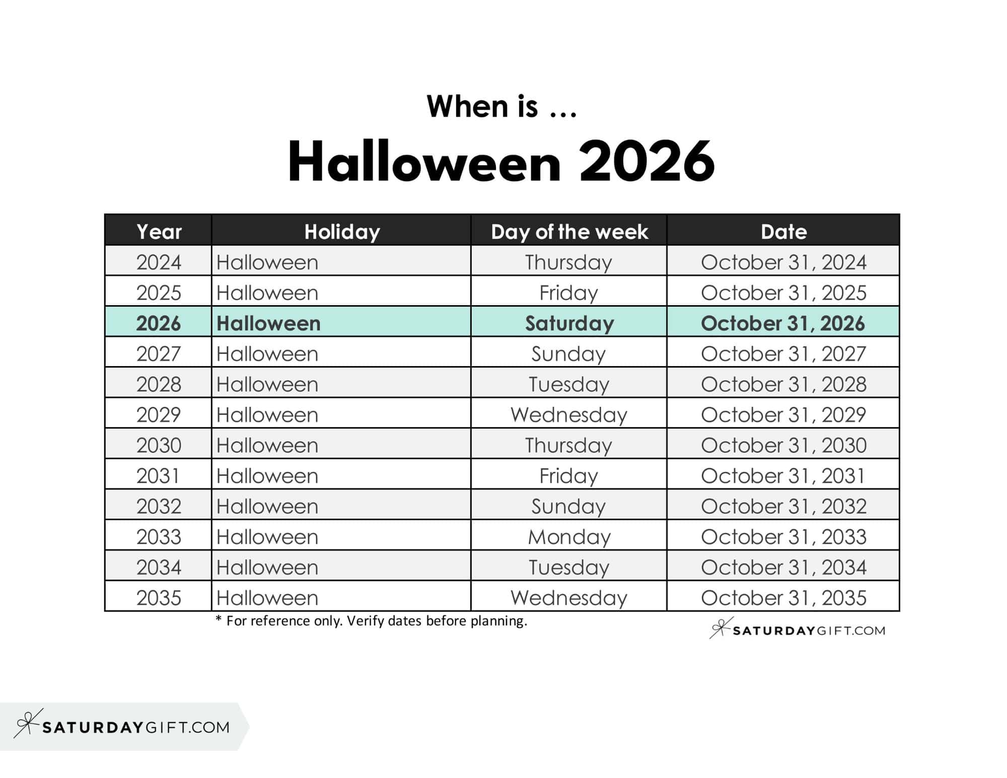 | Halloween | 2026 | Saturday | October 31, 2026 |