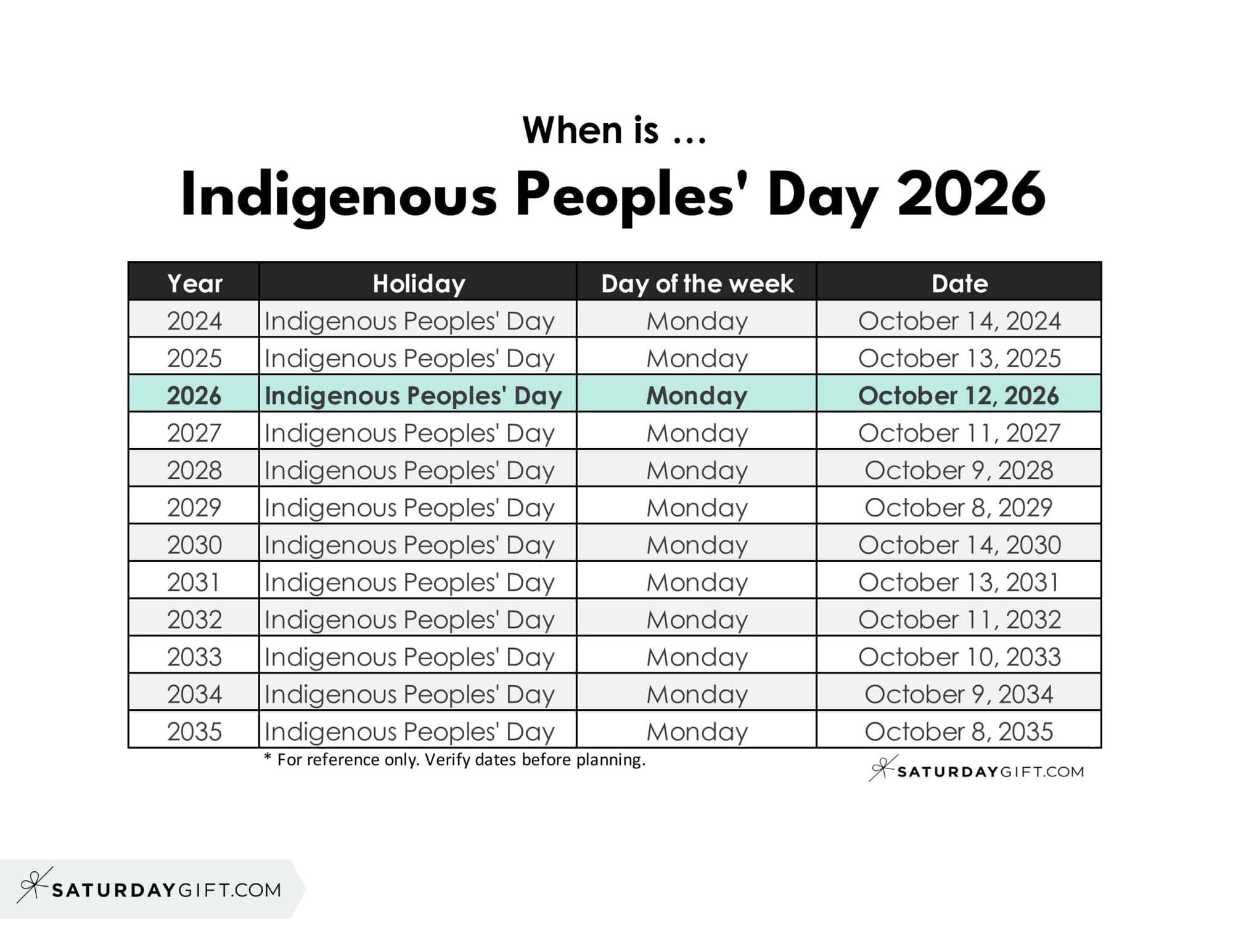 | Indigenous Peoples’ Day | 2026 | Monday | October 12, 2026 |