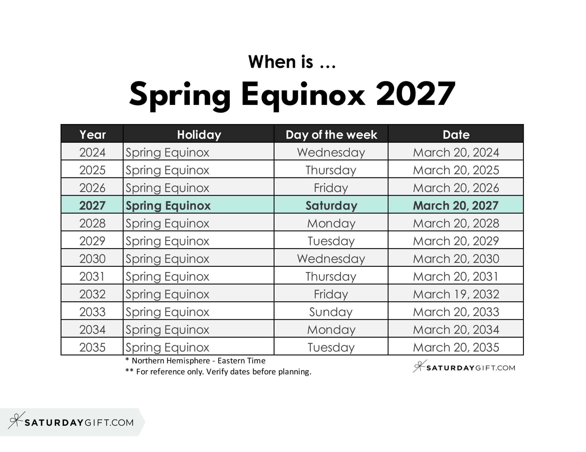 | Spring Equinox | 2027 | Saturday | March 20, 2027 |